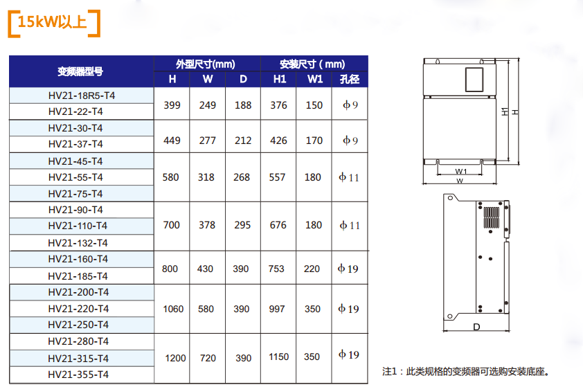 HV21系列变频器适用于功率范围1.5kW-355kW的400V三相异步电机。可广泛应用于标准风机和泵类控制系统。符合IEC/EN61800-3,IEC/EN61000-4,IEC/EN60721-3,IEC/EN61800-5-1等国际标准。